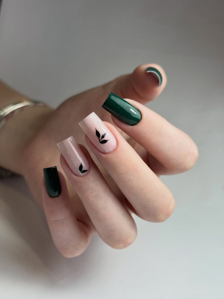 There’s something undeniably chic about rich Green polish paired with minimalist accent art. The glossy deep shade contrasts beautifully with the soft nude base and sleek black detailing. It feels sophisticated but still modern. The square shape keeps everything structured and sharp.