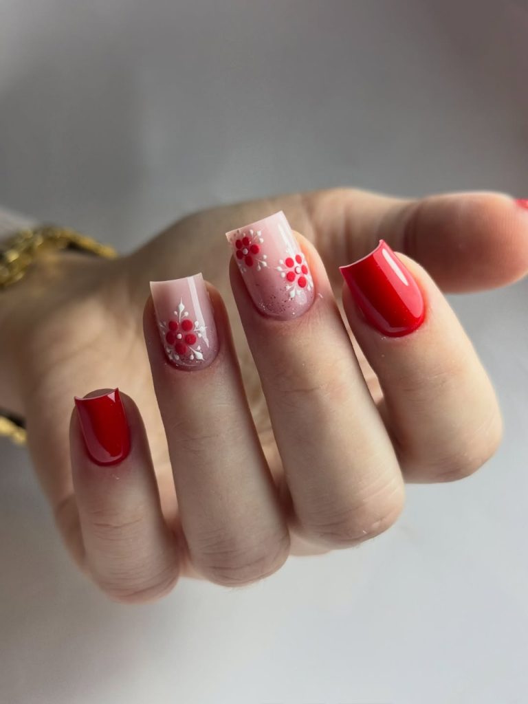 This combination of glossy Red tips and delicate floral accents feels vibrant yet romantic. The contrast between the bold Red and soft nude base creates depth, while the square edges keep the look modern. It’s expressive without feeling overdone—just the right balance of drama and charm.