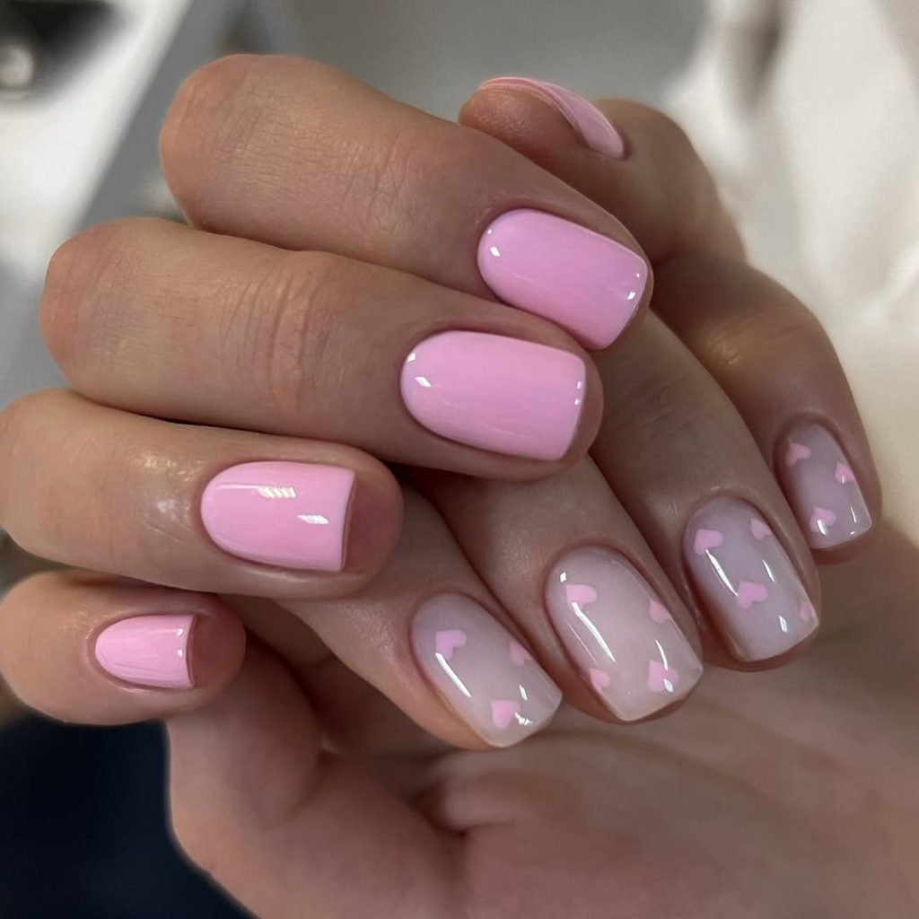 This glossy Pink manicure with tiny heart accents feels sweet but not overly precious. The solid -colored nails ground the look, while the transparent base with subtle hearts adds a Cute, playful twist. It’s lighthearted and Fun without sacrificing sophistication.