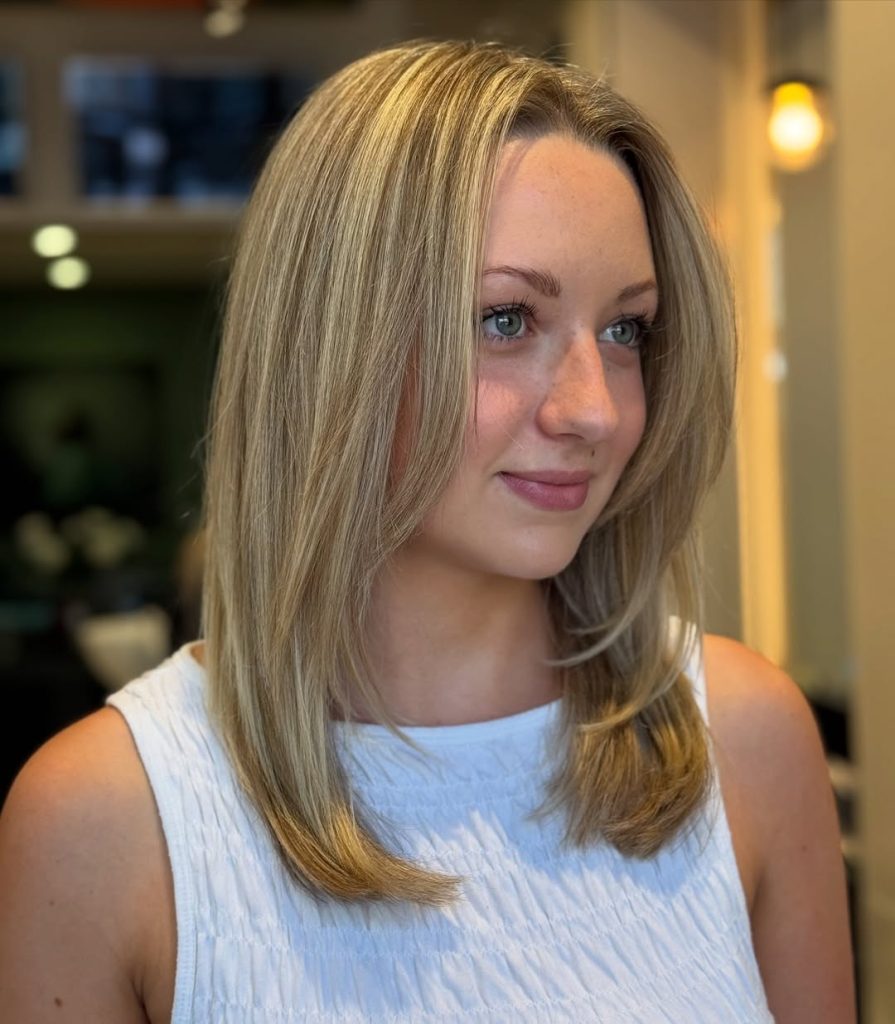 This style is a winner if you prefer low-maintenance options. The blend of Dirty blonde hair with subtle dimensions makes regrowth less noticeable, while the Natural texture keeps styling simple. Air-drying with a touch of wave-enhancing cream or loosely curling a few sections is enough to bring it to life, making it ideal for a Low-maintenance lifestyle that still looks intentional.