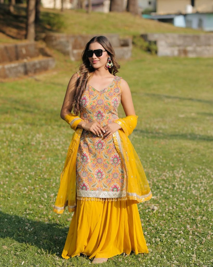 Women who enjoy brightness, joy, and festive energy would perfectly enjoy this outfit. The embroidered kurta balances the traditional and modern with hints of pink and green embroidery that glimmers and adds to the festive confidence of the set. The outfit is made for daytime events and joyful haldi celebrations. Its light, flowing fabric enhances the feminine, soft feel of the outfit and is festive without being over the top.