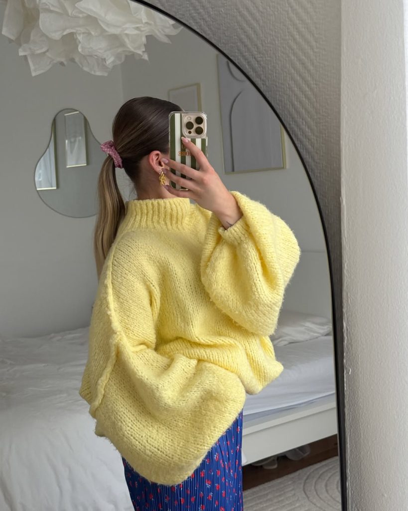 A cozy oversized knit in pastel yellow is pure comfort and style wrapped in one. The chunky texture and voluminous sleeves create a bold yet soft silhouette that feels inviting and expressive. It’s an easy way to bring light into winter wardrobes while staying warm and chic. The sweater’s cozy softness gives that aesthetic “cottage morning” mood—relaxed yet intentional.