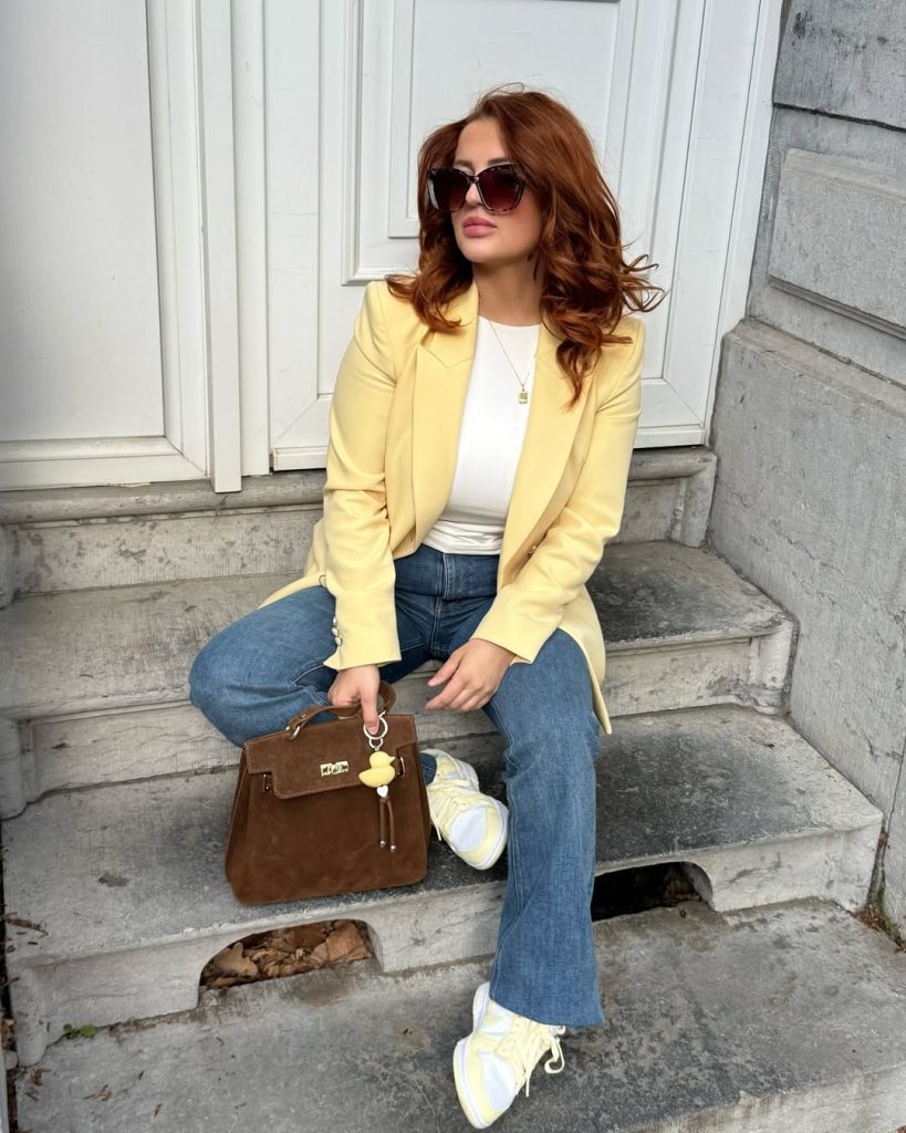 This light yellow blazer brings an instant lift to a classic jeans-and-tee combo, turning an everyday look into something effortlessly stylish. The sunny tone pairs beautifully with blue denim, creating that relaxed yet polished balance. It’s a casual outfit that still feels elevated—ideal for women who love adding brightness to transitional seasons without trying too hard.