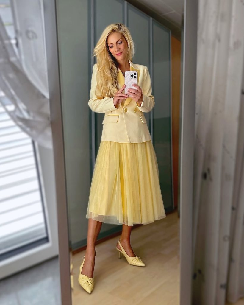 This butter-toned blazer and tulle skirt ensemble is pure sophistication. It carries that soft, dreamy charm while maintaining structure—perfect for women who love a refined yet feminine aesthetic. The tonal match between blazer and skirt elongates the silhouette, while the delicate layers of tulle add a hint of romance that feels timeless and graceful.