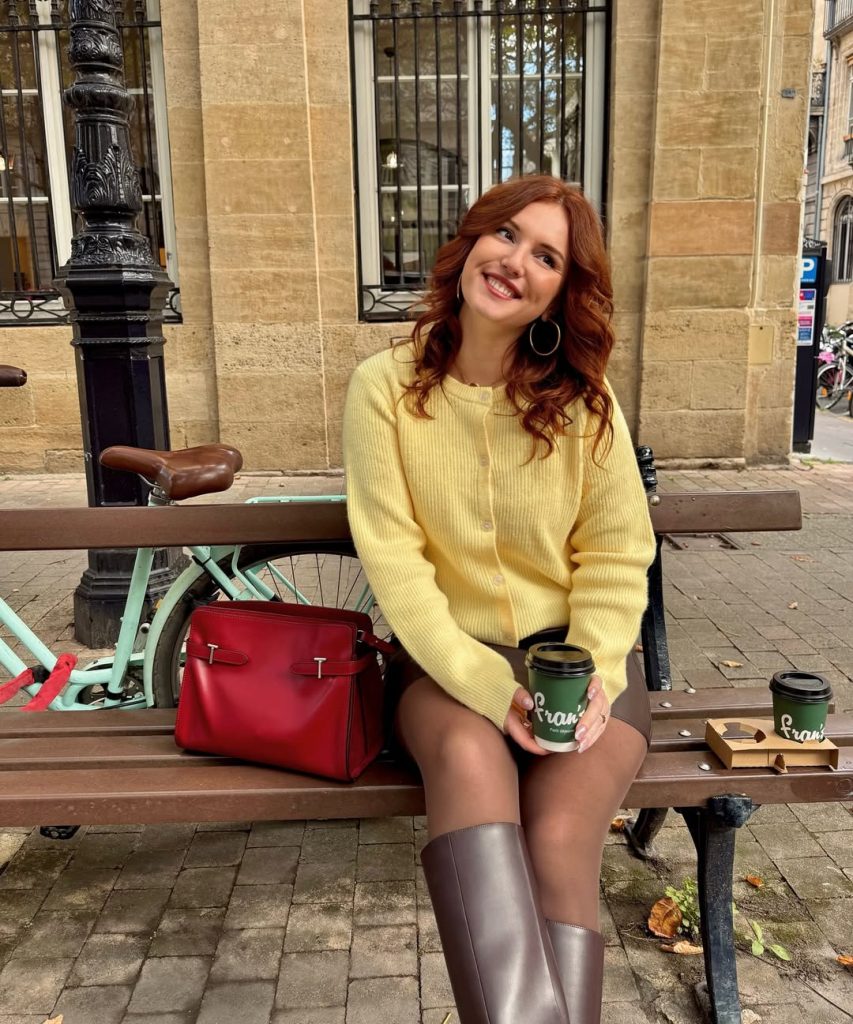 A cozy yellow cardigan brings instant warmth and joy to any chilly day. Paired with dark brown boots and a bold red bag, this outfit radiates a confident, playful energy that feels approachable yet chic. It’s a classic combination that celebrates everyday beauty—relaxed, feminine, and full of personality. Perfect for coffee strolls or casual city days.