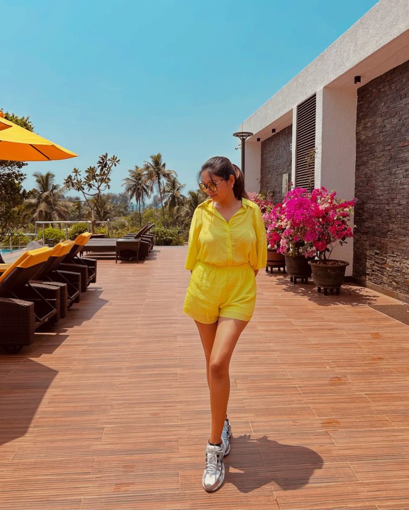 This bold summer ensemble—a yellow blazer paired with matching shorts and a fitted top—screams confidence and sunny energy. The structured yet playful vibe makes it ideal for women who love bright, modern dressing. It’s a statement look that turns heads while keeping comfort at the forefront. Perfect for vacations, rooftop lunches, or beachside dinners.