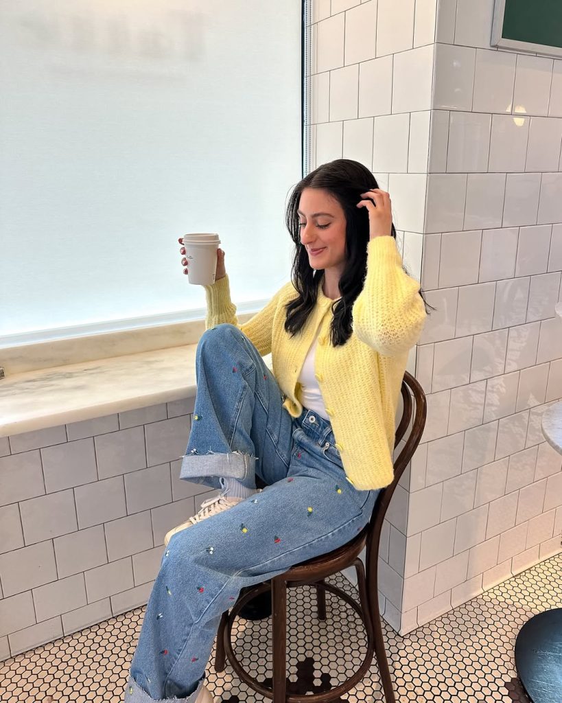There’s something irresistibly charming about pairing a soft yellow cardigan with playful embroidered denim. This look brings a cozy yet joyful feel, ideal for casual days at your favorite café. The bright knit balances beautifully against the blue jeans, creating a laid-back, approachable style that still feels polished and thoughtful.