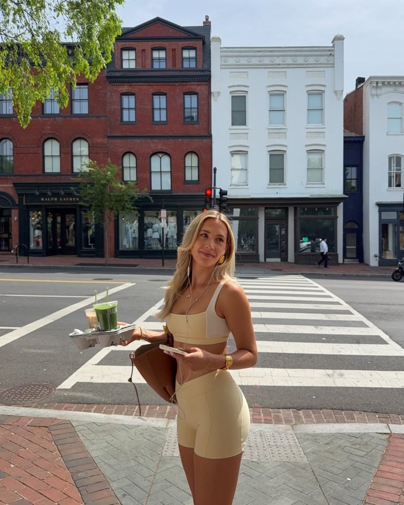 The active set in a creamy yellow tone is a chic combination of sporty and feminine styles. It is a great look for running errands with its set of biker shorts and crop top as well as for a quick smoothie. The soft yellow tone of the set is perfect for a confident yet comfortable look. It is practical, modern, and stylish in its minimalism.