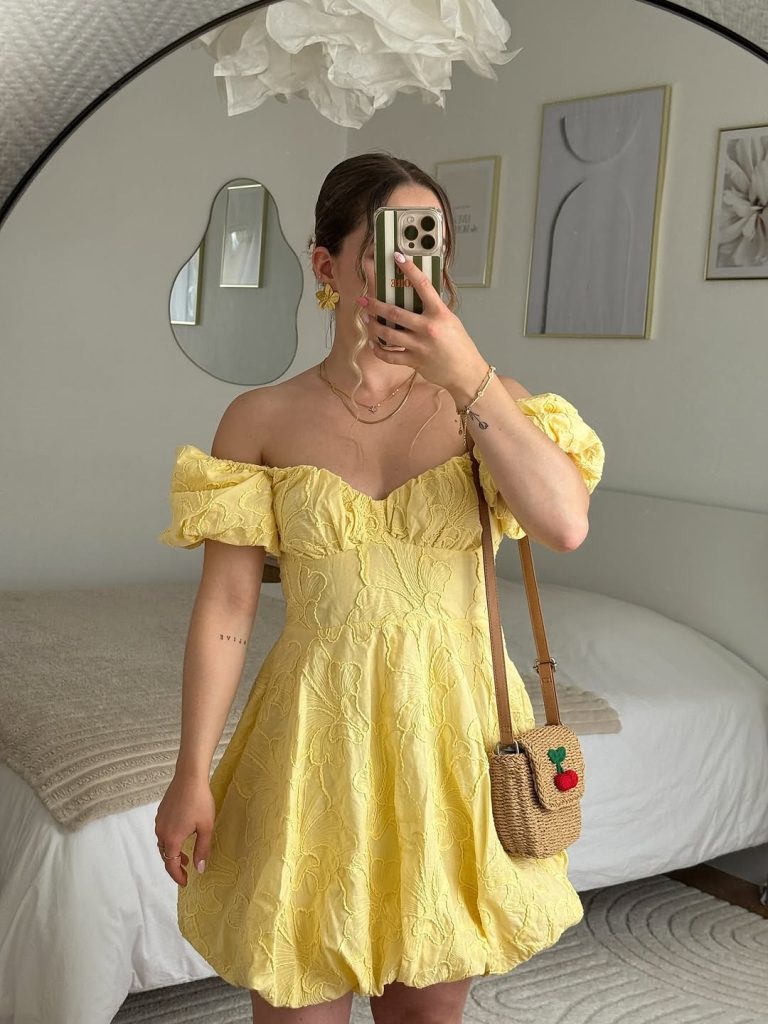 For women who love playful, romantic fashion, this look shines with minimal effort. Pair it with woven accessories and gold jewelry to highlight the sunny color—it’s pure joy in dress form.