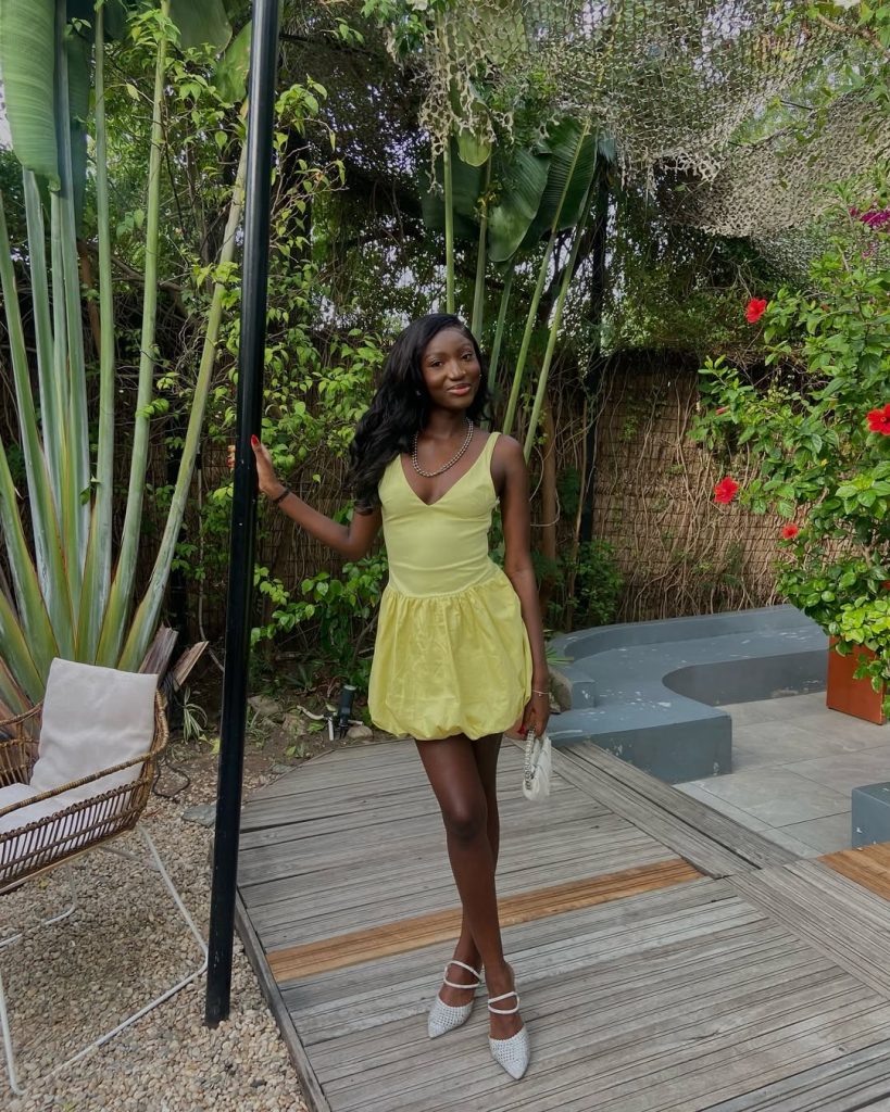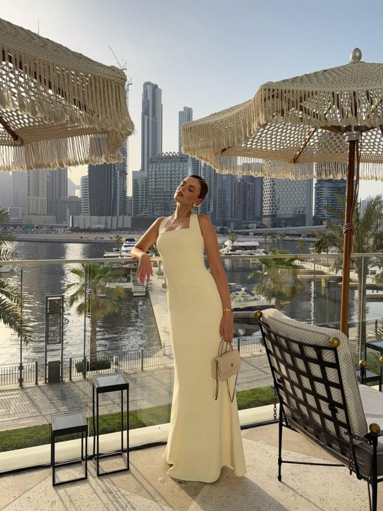 This pastel lemon mini dress feels like a vacation dream—flirty yet refined. The subtle shine of the fabric and soft color evoke effortless sophistication, making it ideal for warm evenings or casual parties. It’s a light and feminine look that plays beautifully with natural textures and soft lighting, bringing out that golden-hour glow.