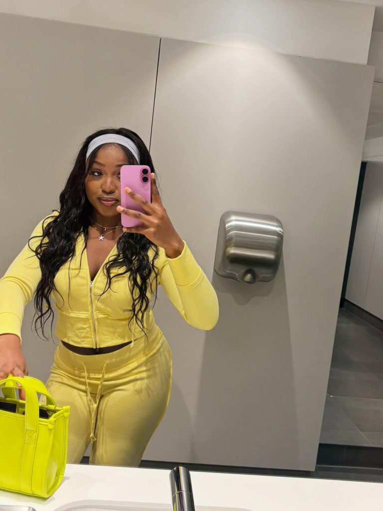 A bright yellow tracksuit can instantly lift your mood—playful, confident, and cozy. This monochrome look gives off that DTI streetwear aesthetic that’s both cute and casual. The cropped hoodie and joggers combo defines the waist while staying relaxed enough for errands or a casual outing. Add a neon mini bag for a modern edge that feels fresh and fashion-forward.