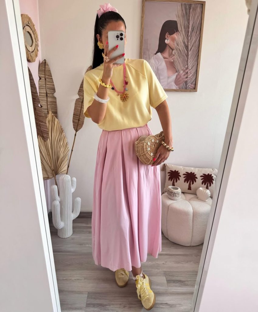 Ideal for women who love mixing tones like pink and yellow, this outfit captures an easy summer vibe. Try it with soft curls, pink lipstick, and playful accessories to highlight your cheerful personality while staying effortlessly stylish.