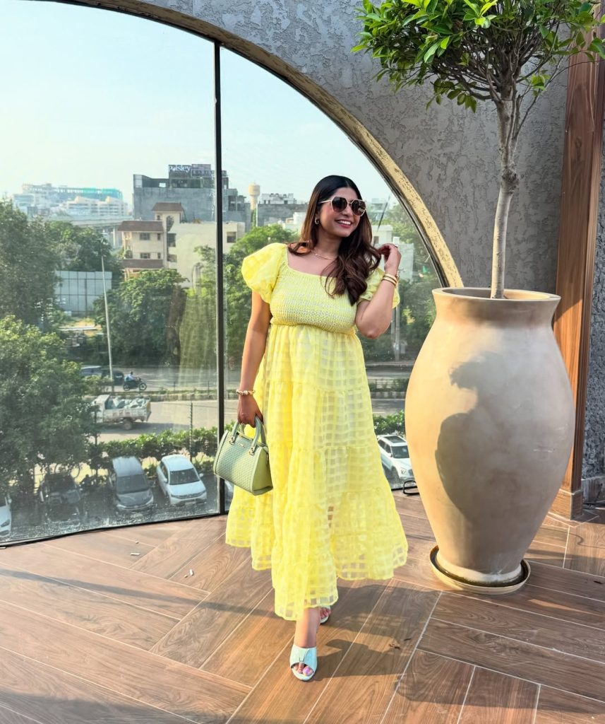 This airy yellow midi dress brings a burst of sunshine into any city scene. The puffed sleeves and flowy check-textured fabric give it a soft, romantic charm that feels both feminine and carefree. It’s the kind of light outfit that pairs perfectly with summer afternoons and radiant smiles. The pastel hue balances brightness with grace, making it ideal for women who love looking effortlessly elegant while staying cool and comfortable.