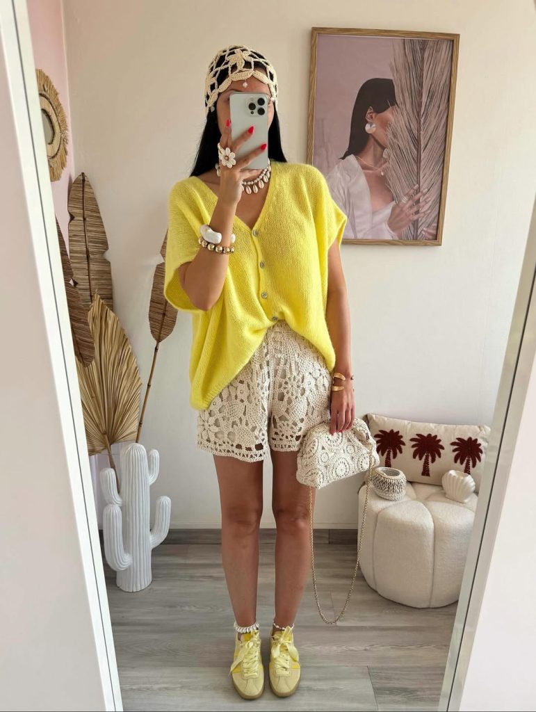 A mix of boho textures and summer ease, this look combines a bright lemon knit top with delicate crochet shorts—playful, stylish, and incredibly comfortable. It’s casual but chic, perfect for women who adore that laid-back beachy vibe with a touch of polish. The oversized knit contrasts beautifully with the intricate crochet detailing, bringing together soft and airy energy.