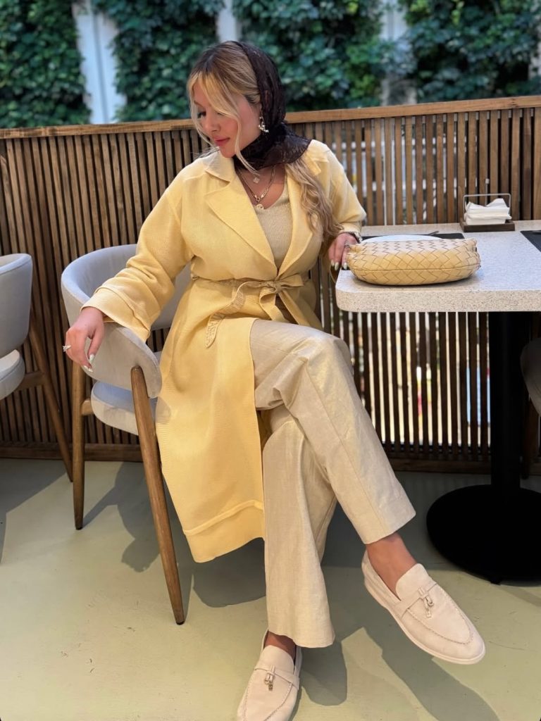 This butter yellow trench coat outfit defines understated sophistication. Its monochromatic palette feels modern and poised, balancing softness with structure. The tailored silhouette, combined with the light tone, brings warmth to winter or early spring looks without feeling heavy. It’s a classy way to introduce yellow into your wardrobe while keeping the vibe elevated and minimal.