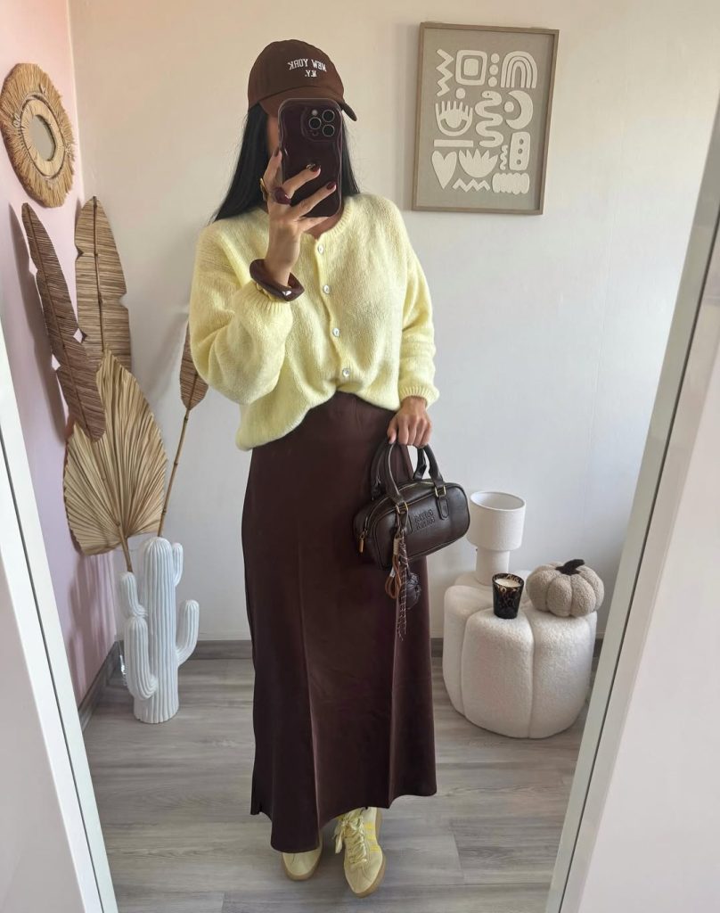 Yellow doesn’t have to be just for summer—this cozy combination of a light yellow cardigan with a dark brown skirt brings the color into autumn with grace. It’s warm, grounded, and subtly chic, especially when styled with a cap and structured handbag. The brown tones add depth, making the yellow pop in a sophisticated, seasonal way.