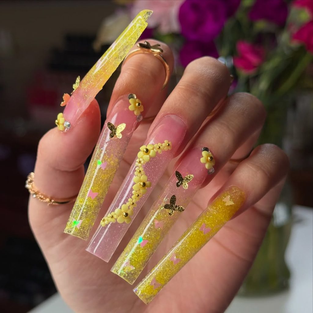 This design is like a limoncello spritz in spring. The long blended lemon-tone acrylics are topped with clear bubbles, little flowers, and butterfly embellishments. Each nail has its story and is a little creative artwork. They are magical, bold, and super romantic without being too busy.