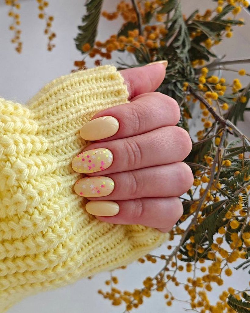 11. Soft Pastel Yellow Short Nails with Confetti Detail