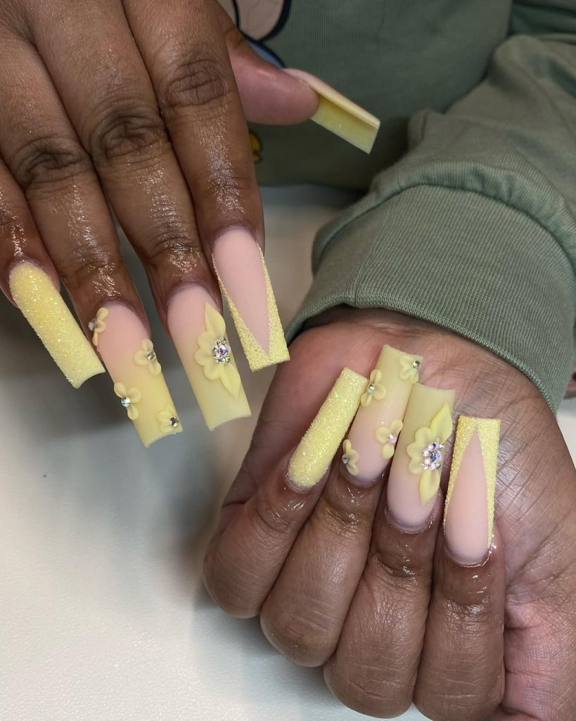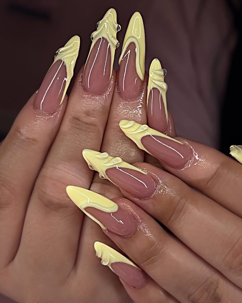 Nothing says love for daring designs and bold nail lengths like this look. Layered designs like this carry a lot of detail and work well when you want your nails to be the main focal point of your style. If you are looking for creatively designed yellow nails for the spring that are fun and full of inspiration, this design really does shine in 2026.