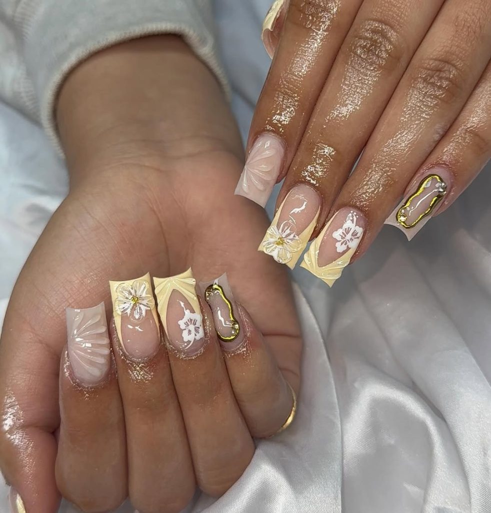 Anyone who enjoys acrylic nails and loves a positive and cheerful look will love this design. While the square shape keeps the design structured, the clear layers allow it to feel light for everyday wear. For those who love floral designs but feel that they may be a little too juvenile, this design falls nicely in between. This design is perfect for spring events and vacations and will elevate your daily nail inspo with the cheerful and intentional look of the design.
