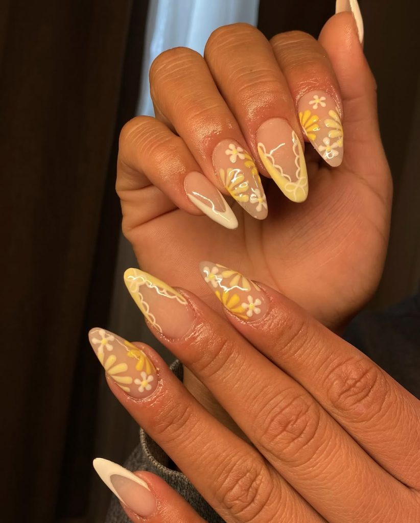 19. Soft pink and yellow floral almond nails are a perfect choice for spring.