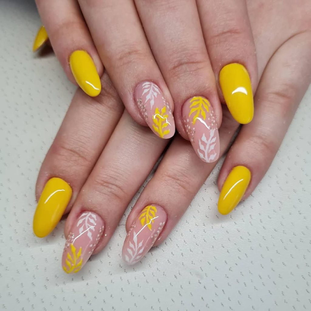 2. Bright Yellow Almond Nails with Delicate Leaf Art