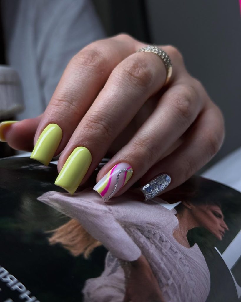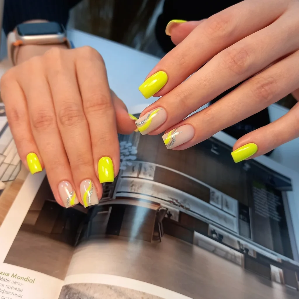 21. Neon Yellow Square Nails with Silver Wave Detail