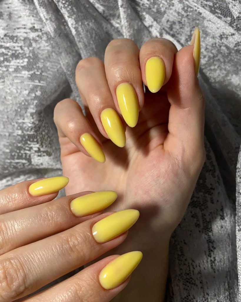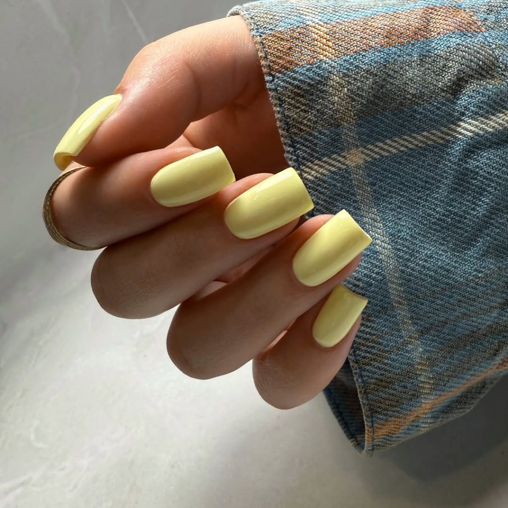 If you appreciate long-lasting looks, this color is definitely for you. It feels timeless, yet gives a bold impression with its simplicity. It goes with every outfit, is easy to maintain, and serves as a perfect base for a more eccentric manicure. For a straightforward, chicer, and modern manicure with yellow spring nails, this look will be a perfect spring 2026 option for you.