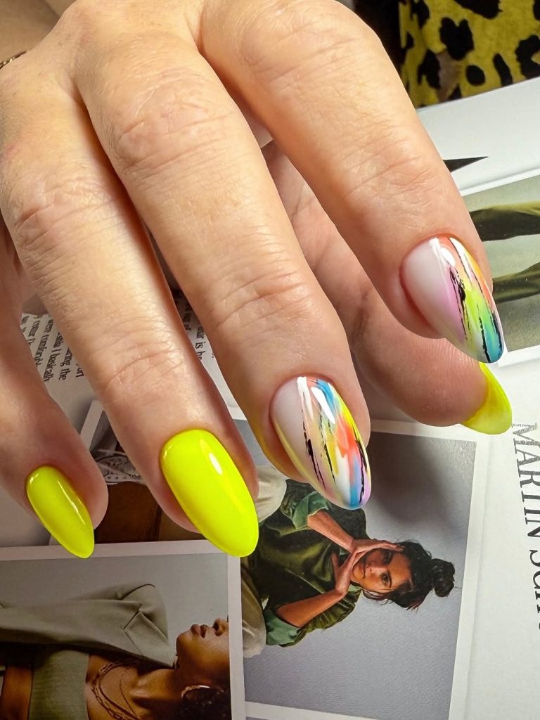 26. Yellow Almond Nails with Colorful Brushstroke Art