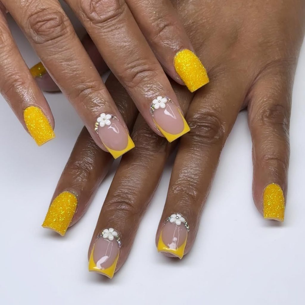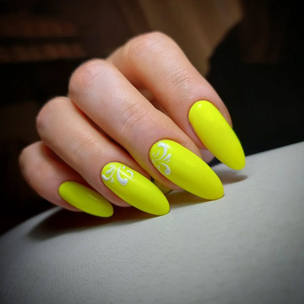 This manicure strikes a beautiful balance between bold and delicate. The bright yellow base feels sunny and optimistic, while the white floral art adds a soft, feminine contrast. The almond shape gives the nails an elegant flow, making the overall look feel polished rather than loud.