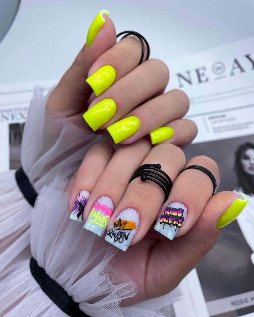 8. Neon Yellow Short Nails Featuring Graphic Art Inspiration