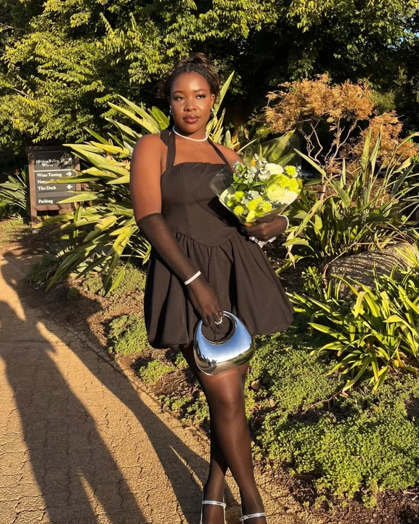 A chic black mini with sheer gloves sets a striking tone—timeless, feminine, and perfect for anyone who leans toward Black women’s elegance with a hint of vintage drama.
