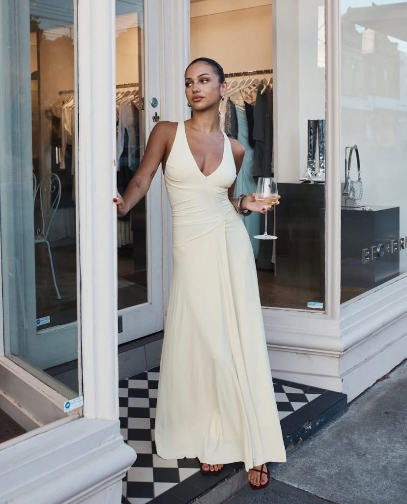 This is a beautiful option for elegant restaurant dinners, winery celebrations, or a formal birthday night where you want something classy but not flashy. Add personality with a delicate gold bracelet or soft bronzed makeup. Avoid statement necklaces—they interrupt the deep V’s refined simplicity. This dress carries the quiet-luxury aesthetic often spotlighted on Who What Wear, perfect for anyone who prefers subtle elegance over bold color.