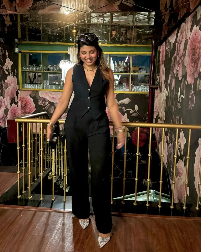 This outfit suits everything from a 30th birthday dinner to a stylish rooftop celebration. It strikes the right balance between casual and sophisticated, giving you space to move, laugh, and celebrate without fuss. Add personality with a bold clutch or colorful manicure—just steer clear of overly bright shoes that interrupt the sleek monochrome line. This style also works beautifully for modest fashion lovers who want coverage without losing shape. Perfect for upscale cocktail bars and floral-themed venues (just like the one she’s standing in), and a favorite among fashion editors who swear by the tailored-jumpsuit rule at events.