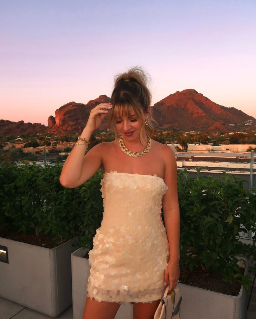A shimmering strapless mini dress in oversized champagne sequins—playful, bright, and effortlessly cute for sunset celebrations.