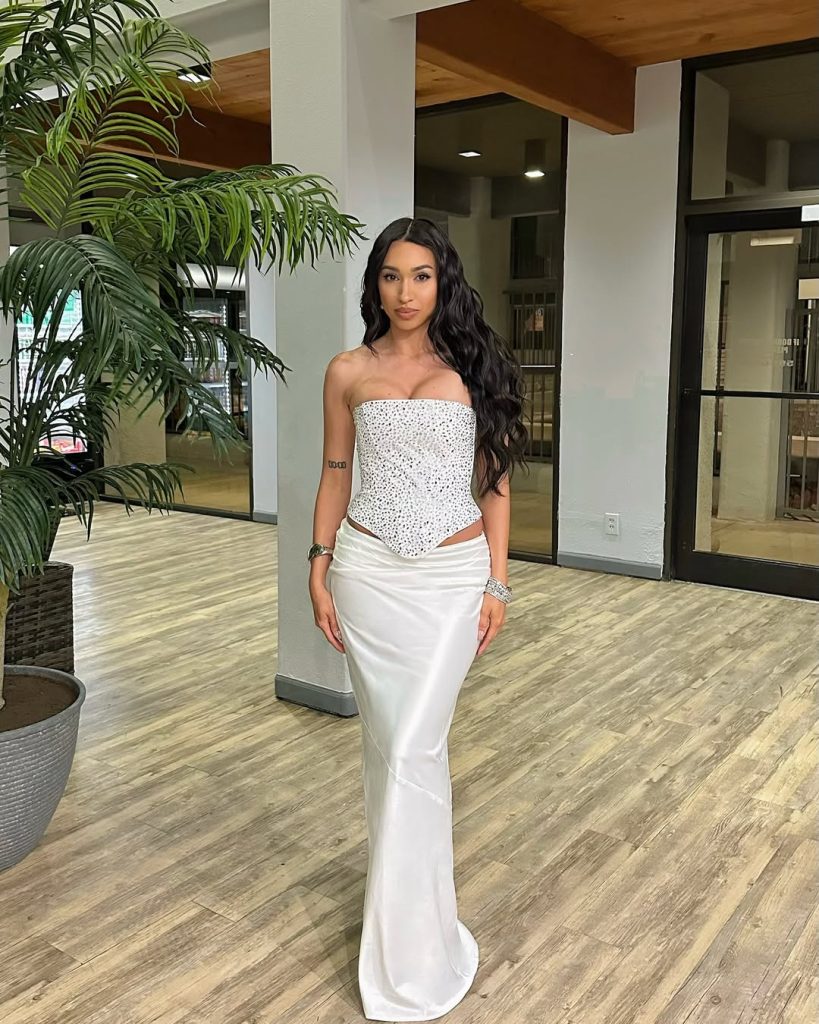 A sparkling embellished corset paired with a long ivory satin skirt—timeless glamour with a modern party twist.