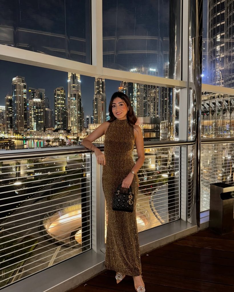 A shimmering gold maxi dress that mirrors the glow of the city lights—perfect for a night celebration that feels elevated and unforgettable.