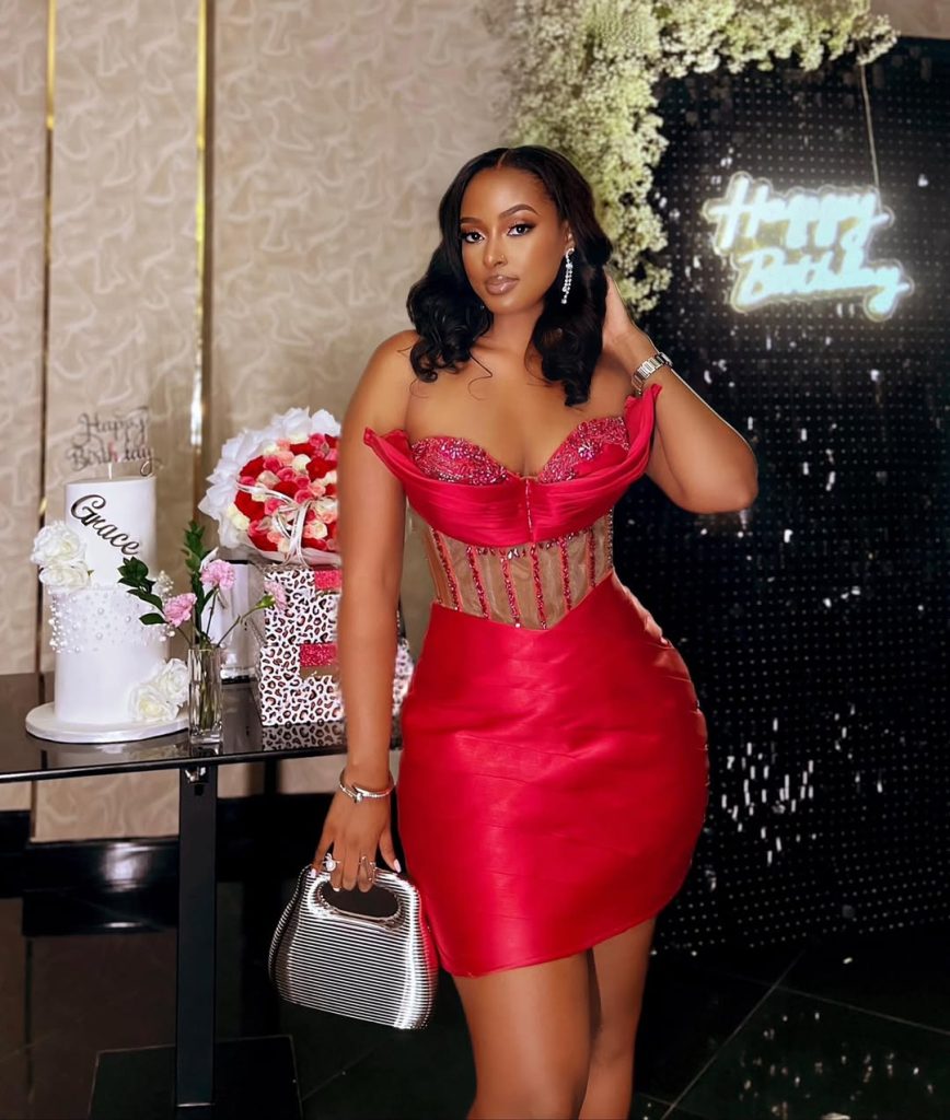 A corset-style red mini dress brings a sultry, sculpted look—ideal for anyone who loves red, high-glam ideas, and a little birthday drama.