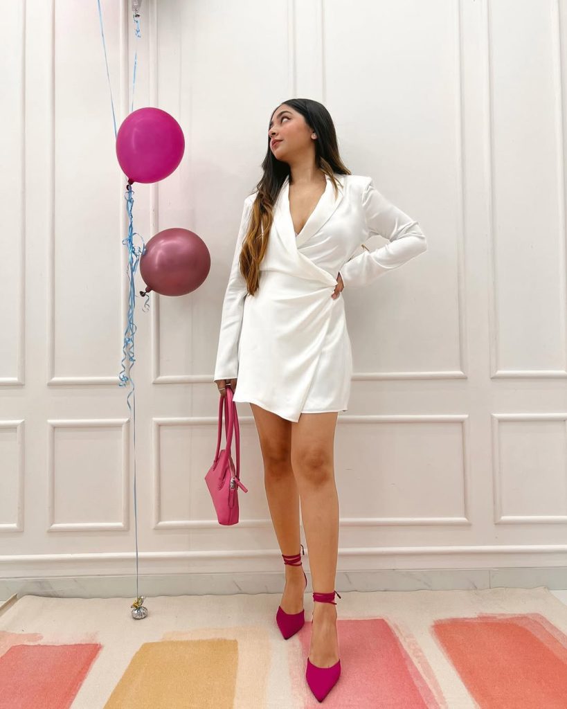 A crisp white satin wrap dress paired with bright pink accessories creates a fresh, playful look—perfect for anyone who wants a cute but polished birthday moment.