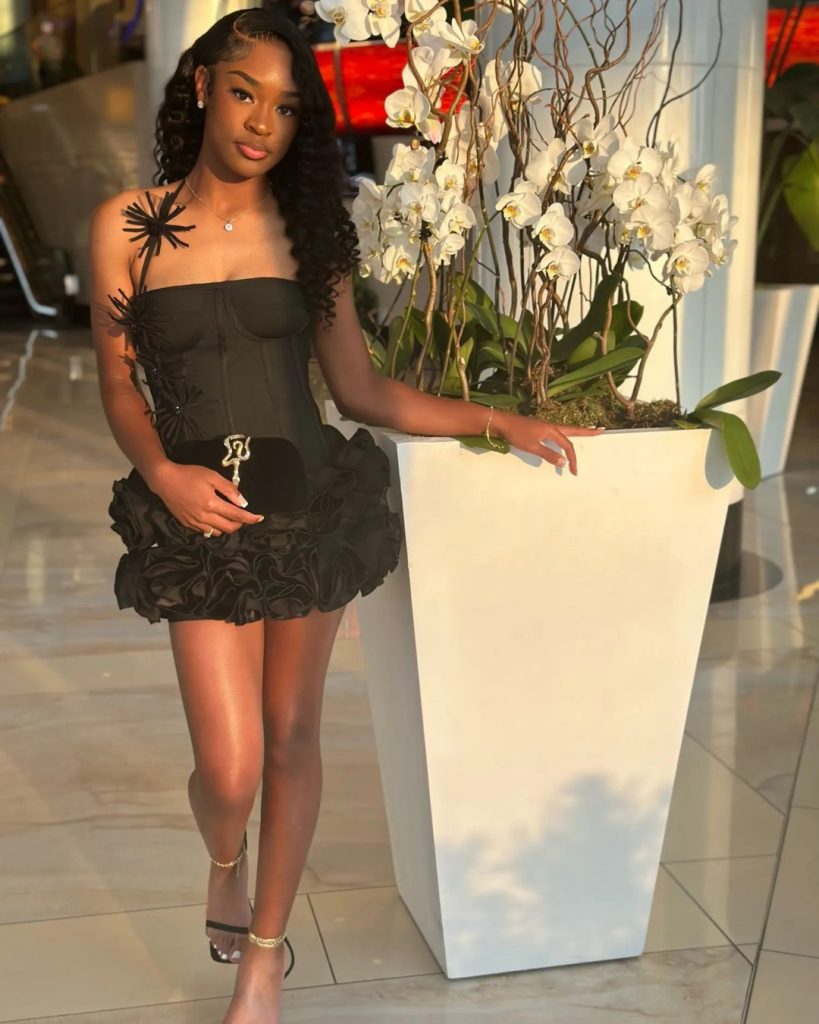 A sculpted black mini with floral appliqués gives a chic, editorial feel—ideal for Black women looking for baddie-leaning birthday elegance.