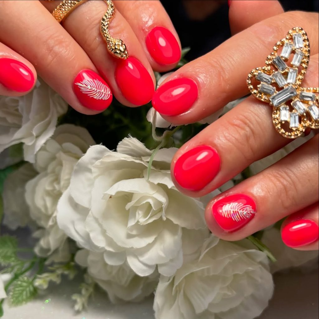 This coral manicure evokes the essence of springtime. The high-shine finish makes the Bright color pop, while the delicate white leaf Art detail adds just enough personality to make it special. This manicure exudes refinement, romance, and a hint of playfulness, reminiscent of pairing your favorite statement ring with a classic outfit.