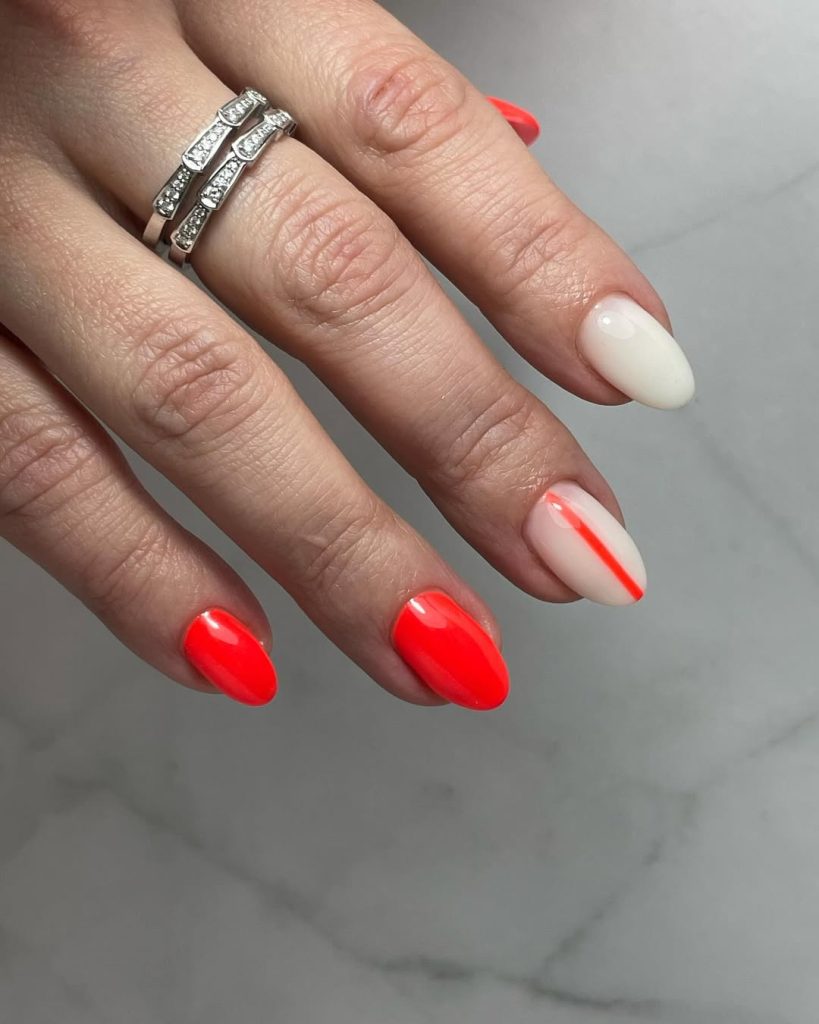 There’s something bold about mixing matte coral with creamy white. The Almond shape adds elegance, while the contrast between Bright coral edges and soft milky centers feels fresh and slightly unexpected. It’s a manicure that says you’re confident enough to play with color—and it pays off beautifully.