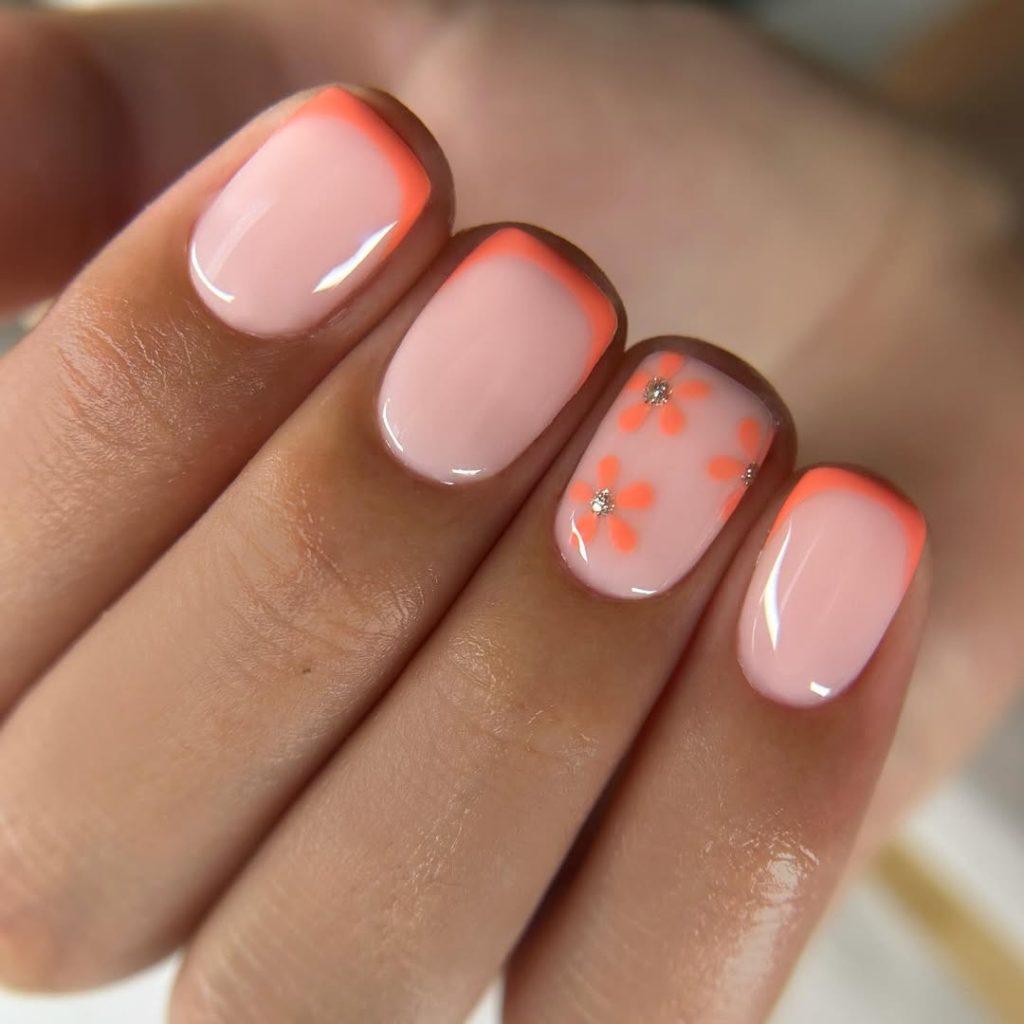 This design feels like sunshine on a fresh spring morning. A milky pink base maintains a soft and feminine appearance, while the neon coral French tip adds a bright, energetic edge that we love in 2026. The accent nail with simple coral flowers and tiny rhinestone centers gives just enough sparkle to feel special without overwhelming the manicure.