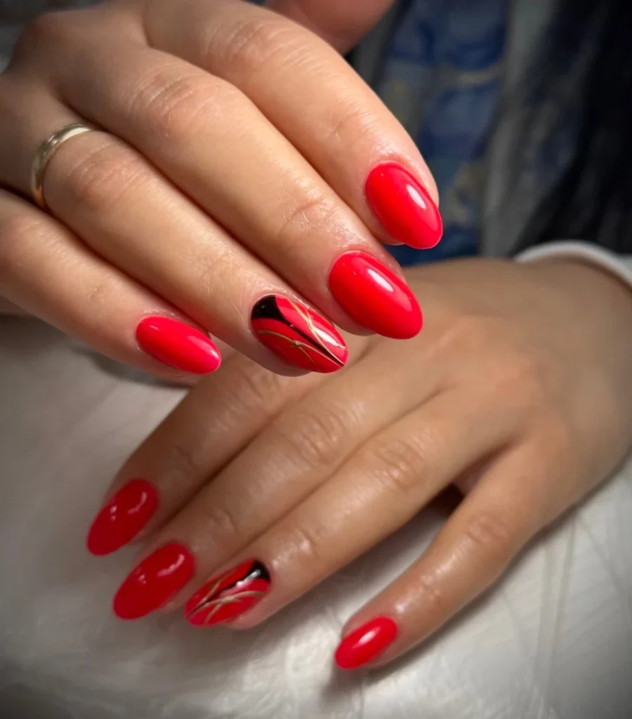 Bold, confident, and impossible to ignore—this fiery red manicure makes a statement. The almond shape elongates the fingers beautifully, and the high-gloss finish amplifies the intensity of the Bright red tone. The accent nail with black and fine gold lines adds a sleek, modern Art touch that feels elevated and chic.