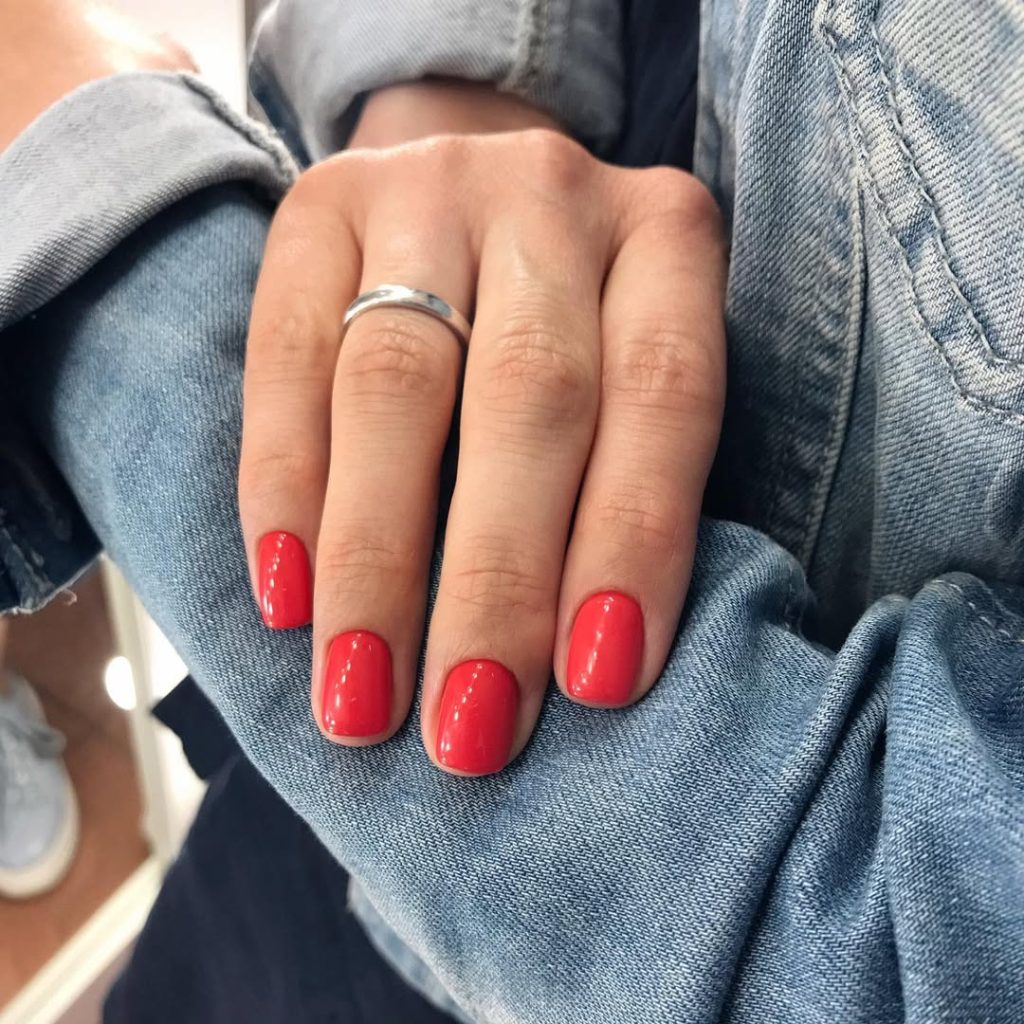 Sometimes, all you need is a flawless, glossy coral manicure. This short square shape is clean, practical, and effortlessly stylish. The vivid coral-red shade feels Bright and summery, yet it’s still polished enough for everyday wear.