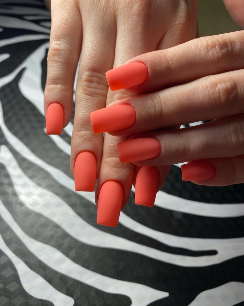 For those who love length and presence, this matte coral long square manicure delivers. The rich coral tone feels saturated and Bold, while the matte finish keeps it contemporary rather than flashy. The structured square shape adds definition and confidence.