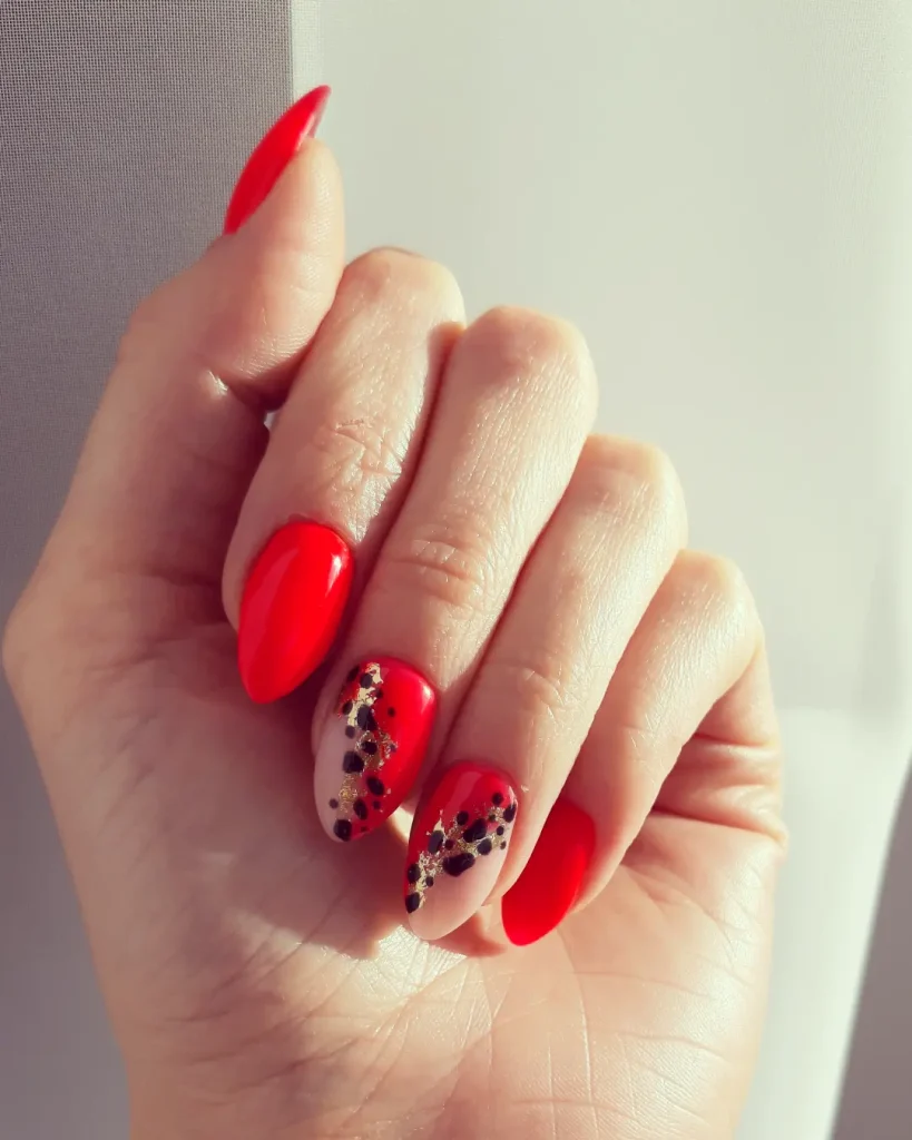 This bold red almond manicure feels glamorous and confident from every angle. The glossy, Bright red base is timeless, but the real magic happens on the accent nails, where gold foil and black speckled detail create a luxe, almost abstract Art effect over a soft nude fade. It’s dramatic without feeling overdone.