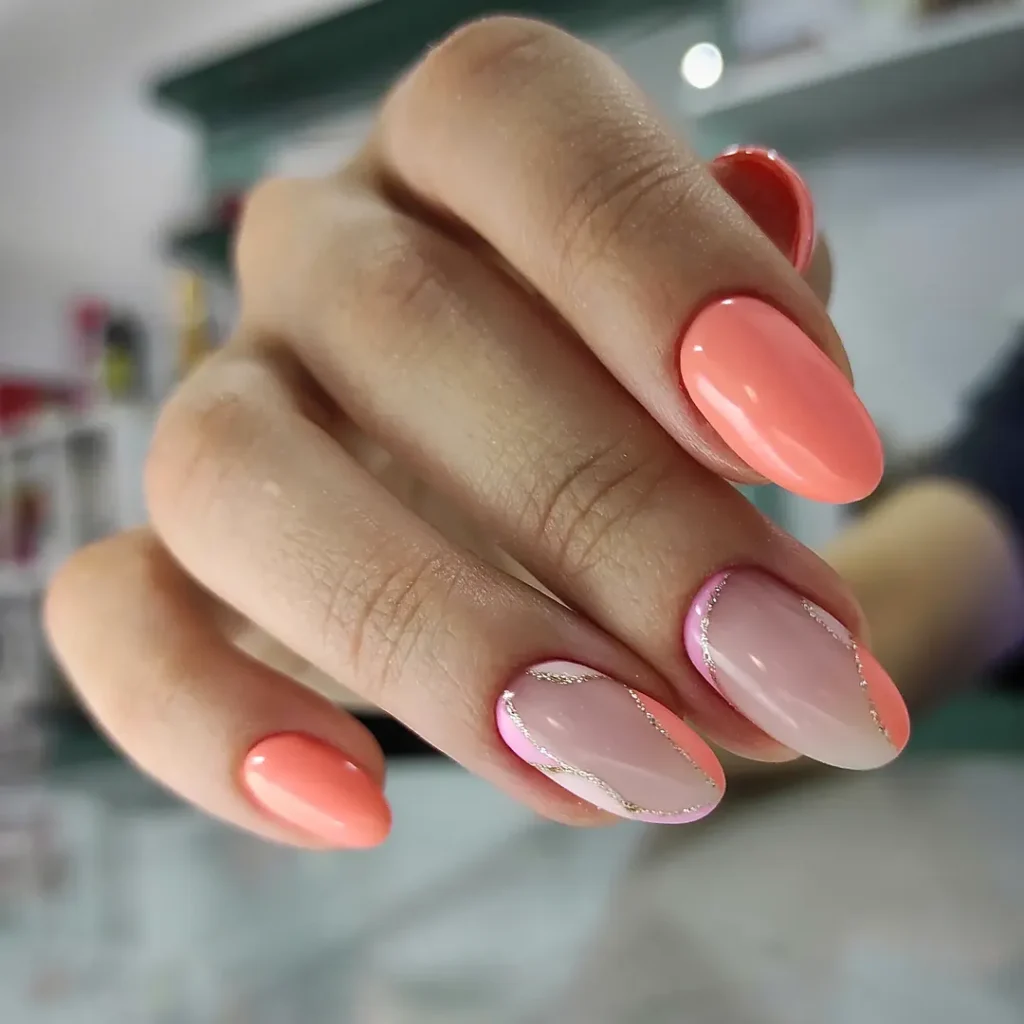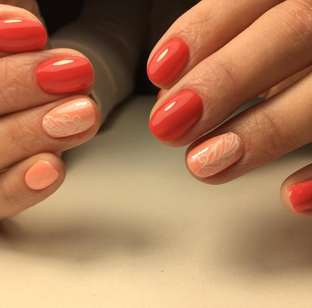 This coral and peach combination feels soft, romantic, and beautifully balanced. Glossy coral nails are paired with peach-tone accents that feature delicate white swirl art that adds a graceful, almost lace-like detail. The result is warm and harmonious without feeling too busy.