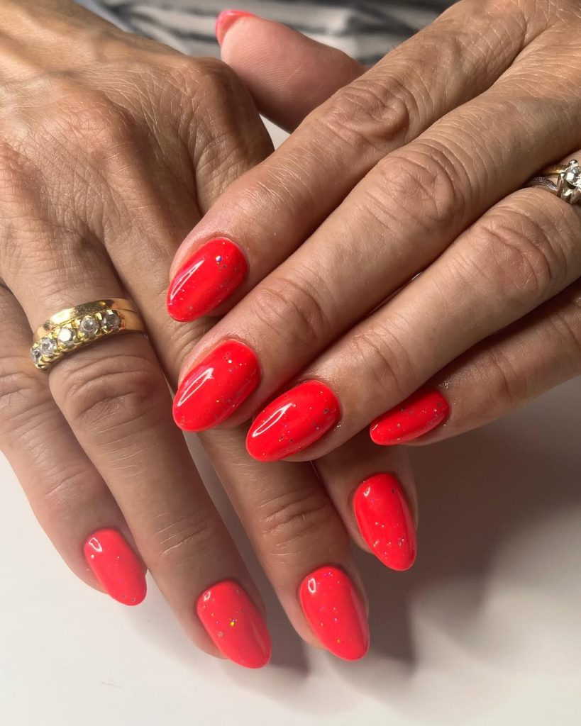 This neon coral manicure is pure energy. The high-gloss finish amplifies the Bright shade, and the subtle scattered glitter flecks add just enough shimmer to catch the light without overwhelming the design. It’s playful, vibrant, and perfect for sunny days.