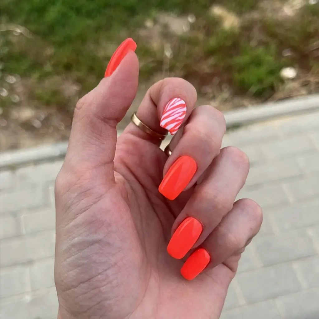 Bold neon coral takes center stage in this striking square manicure. The glossy finish keeps it sleek, while the zebra-inspired accent nail adds a fun, modern twist. The white and coral pattern adds movement and personality while complementing the overall bright tone.